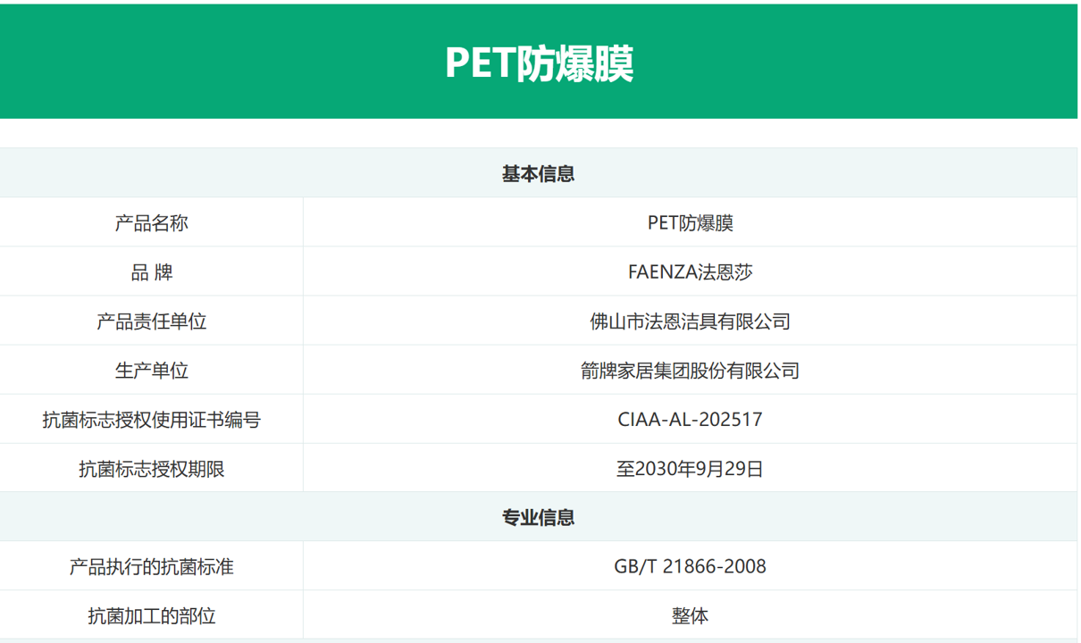 日前,箭牌家具集團(tuán)股份有限公司旗下箭牌、安華和法恩莎品牌PET防爆膜,通過CIAA的嚴(yán)苛審核,同時(shí)獲得抗菌標(biāo)志使用授權(quán)。01 抗菌標(biāo)志:代