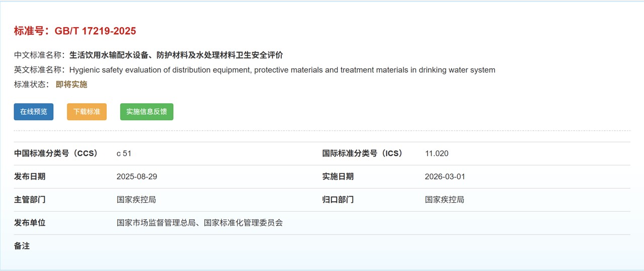 涉水產(chǎn)品注意了!GB/T 17219-2025《生活飲用水輸配水設(shè)備、防護(hù)材料及水處理材料衛(wèi)生安全評(píng)價(jià)》即將實(shí)施